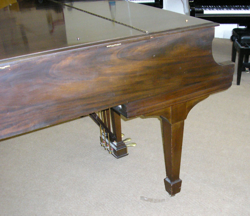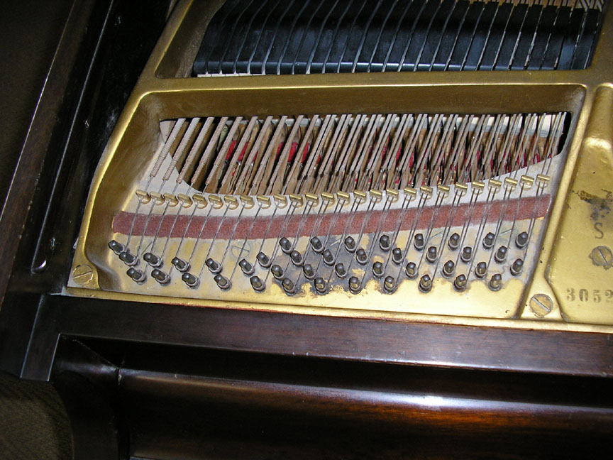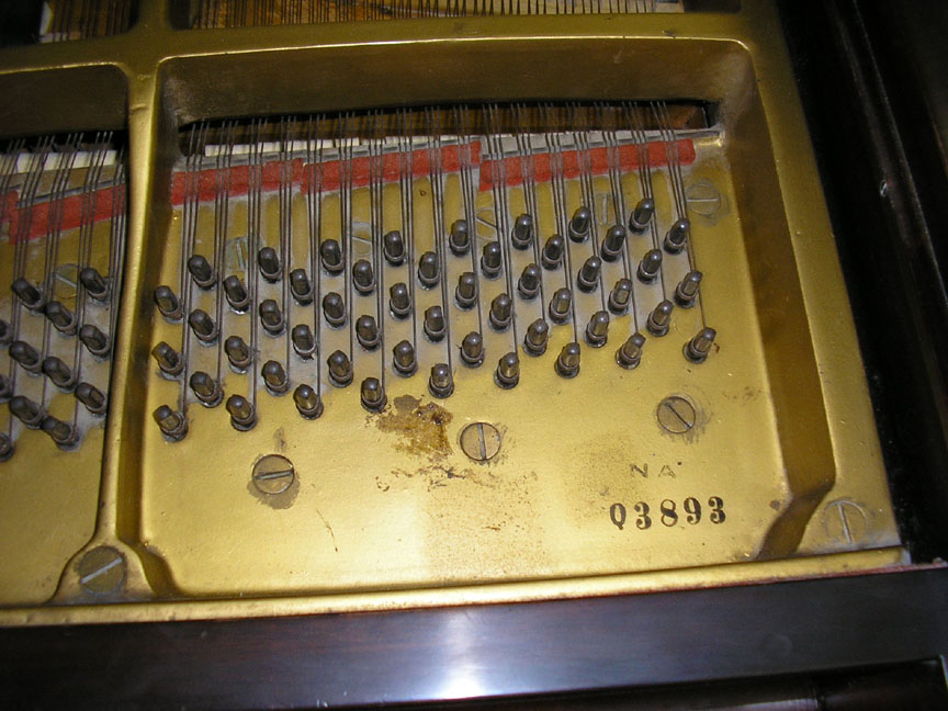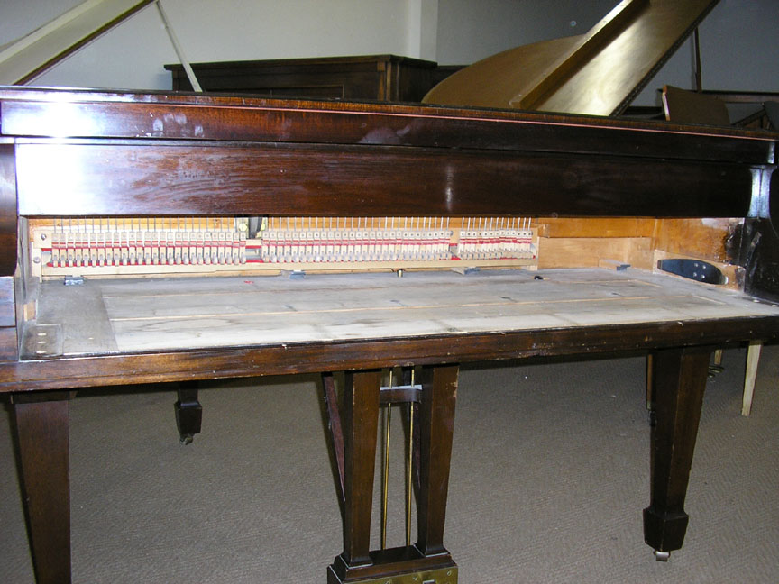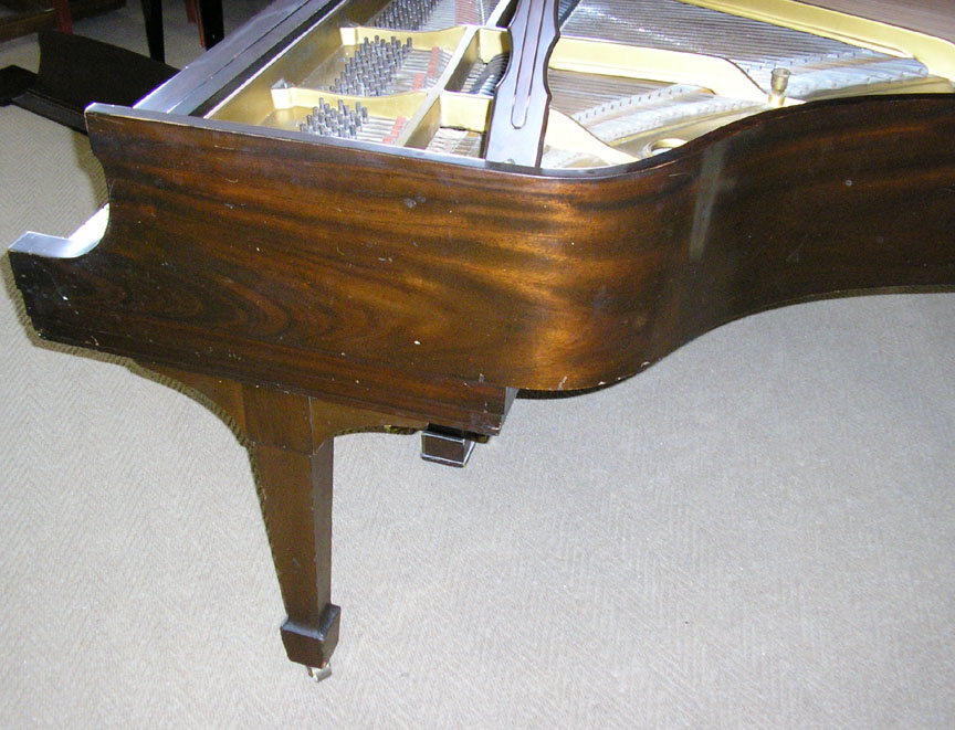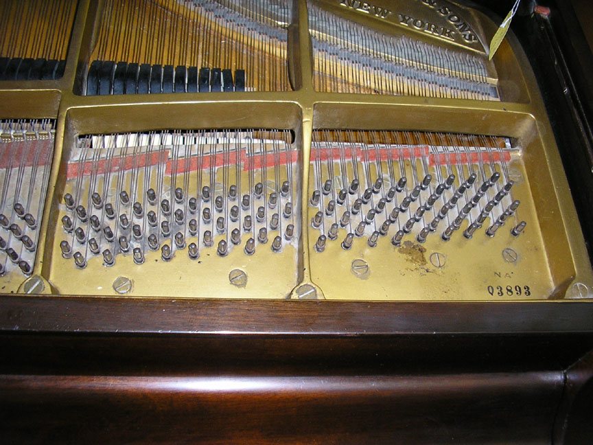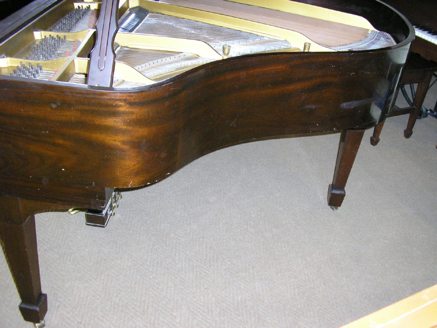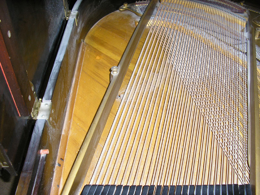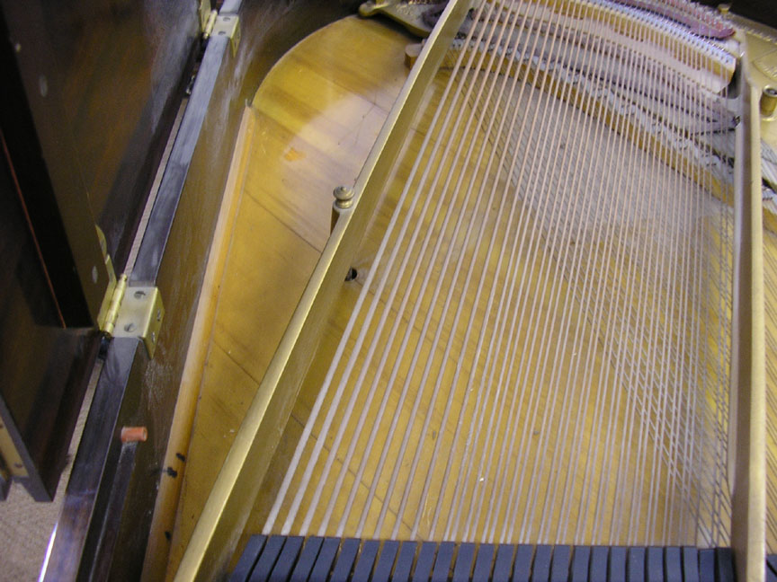 Note: Filed hammers, chip on rear of Lyre, soundboard cracks. Exterior of case could use some furniture polish but since it is thought that the next owner would like to have it refinished, this is not a good thing to do in our opinion, impeding a good refinish.